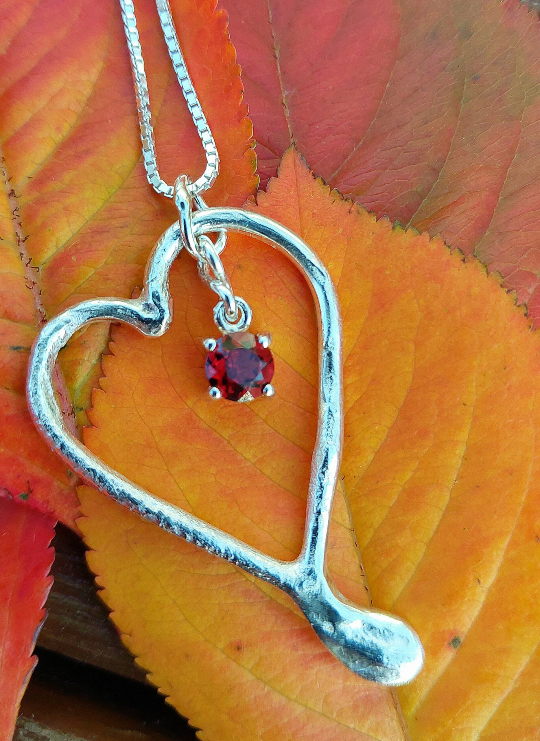 2x 3 cm sølvhjerte, formet for hånd i det sølvet smelter. I hjertet henger en 5 mm rød granat som dingler fint når smykket er i bruk. Unik modell. Kjede bestilles separat