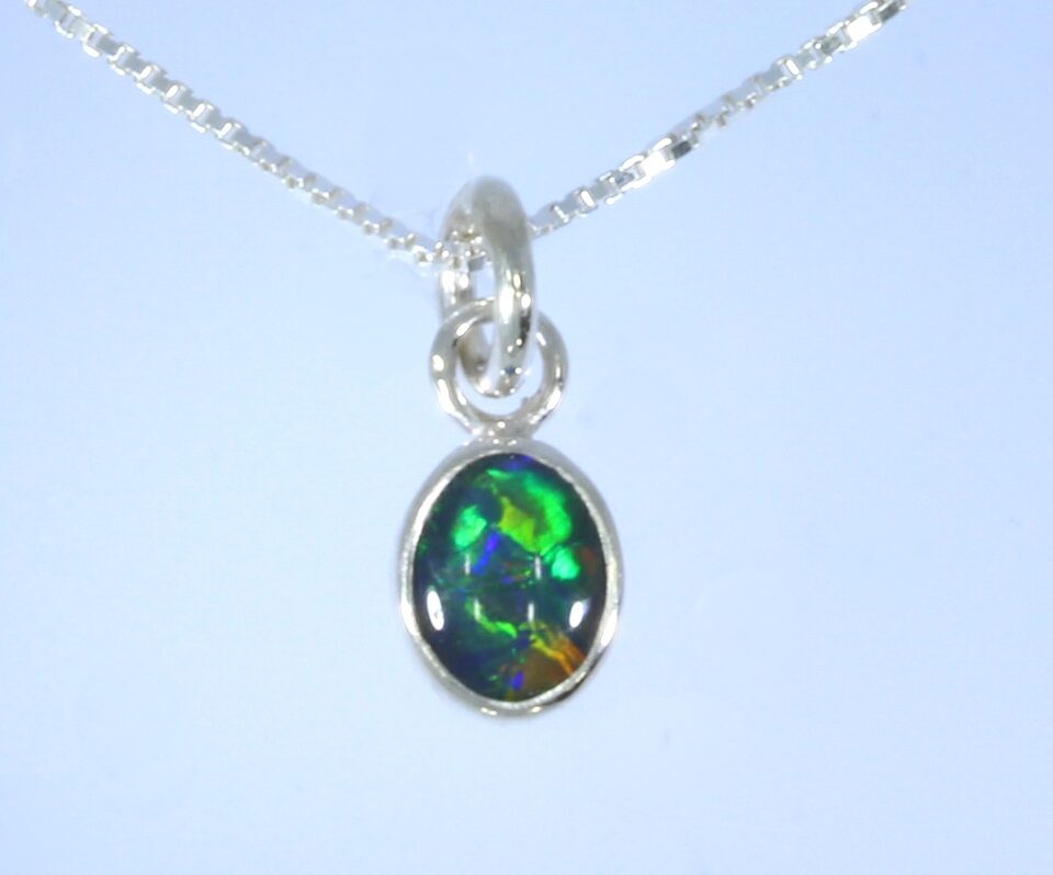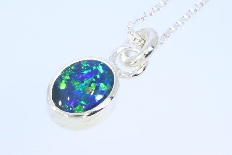 Sølv anheng med opal triplett 9 x 7 mm. Sterkt fargeskinn i blå/ grønn. Høy kvalitet på steinen. Kjede bestilles separat.