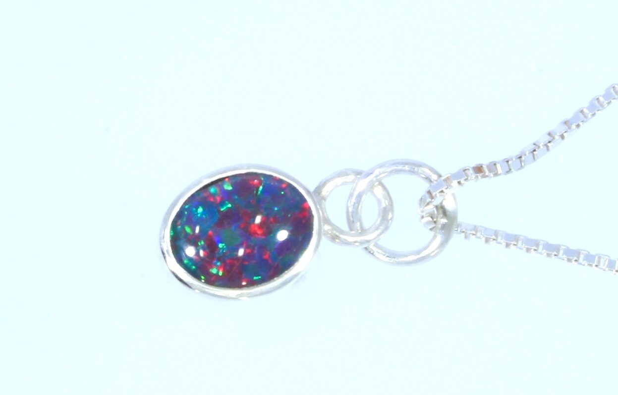 Opal triplett 9×7 mm, sterkt skinn i blå/ grønn og rød/ orange. Innfattet i 925 sølv, kjede bestilles separat.