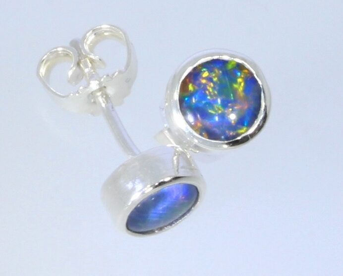 6 mm opal triplett som skinner i blå/grønn med innslag av rød/gul. Høy kvalitet med sterke farger. Innfattet i 925 sølv.