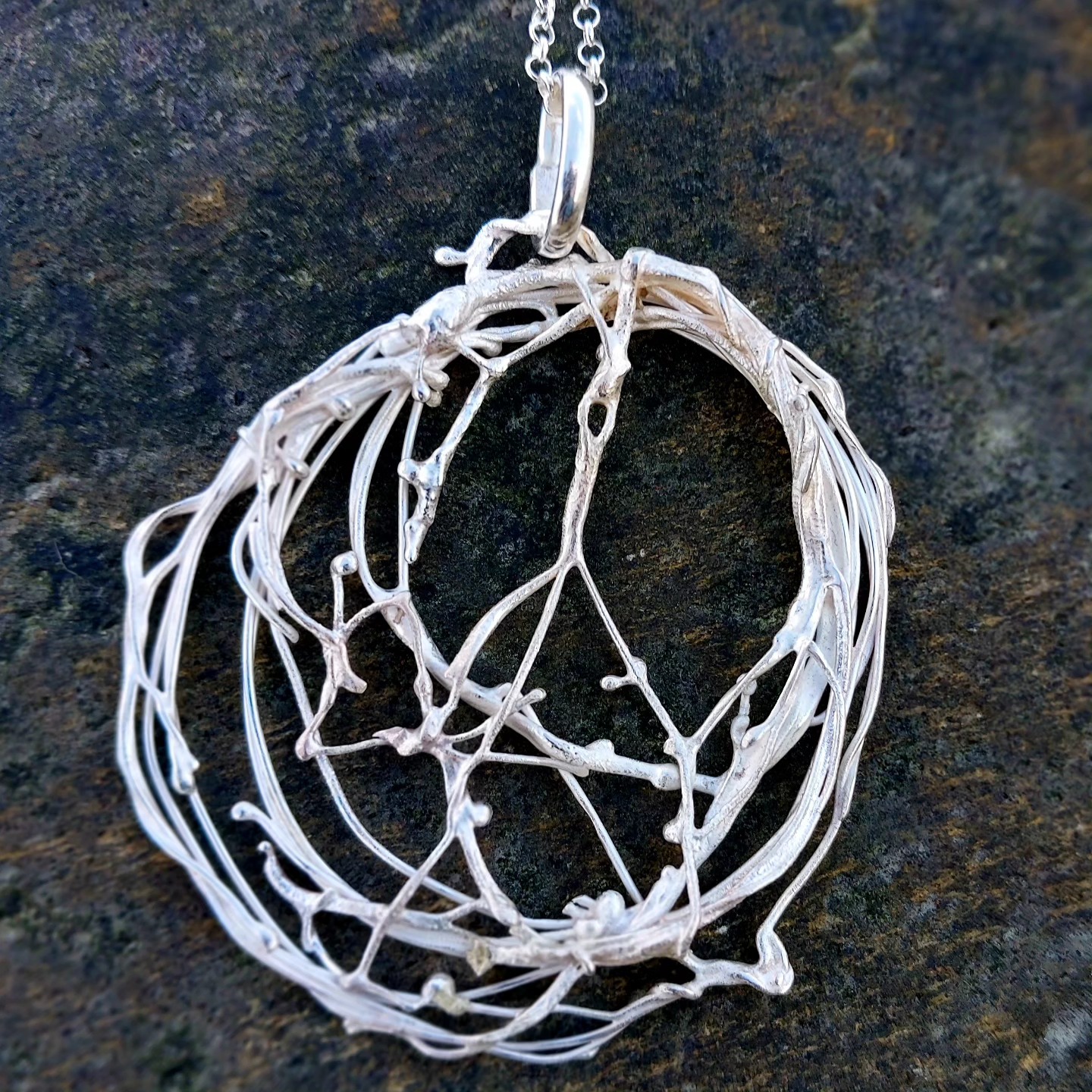 Håndlaget, unikt sirkel smeltesmykke 6 cm bredt. Tilbudspris nå inkludert kjede 50 cm.